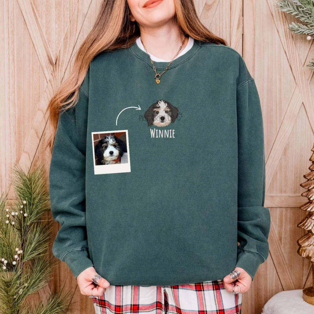 Their pet embroidered on a premium quality & UNISEX Comfort Colors sweatshirt, made with love and made to last. Hyper-detailed, unique and made to last.